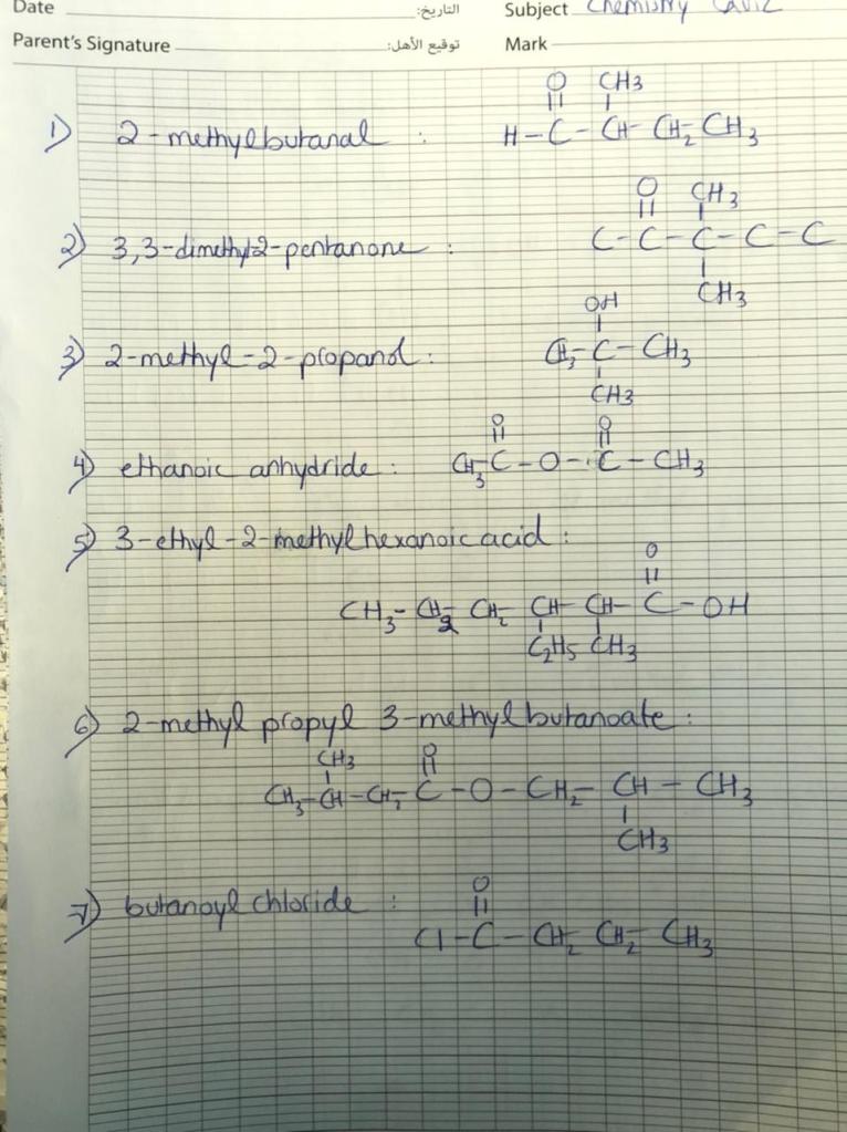 As mentioned above, to evaluate students in this chapter, I usually draw organic compounds from the different families ( Alcohol, Aldehyde, ketone, Carboxylic acid, Ester, etc.) and ask students to nominate them or I ask them to draw the listed compounds ( Organic compounds from the different families). See sample quiz!