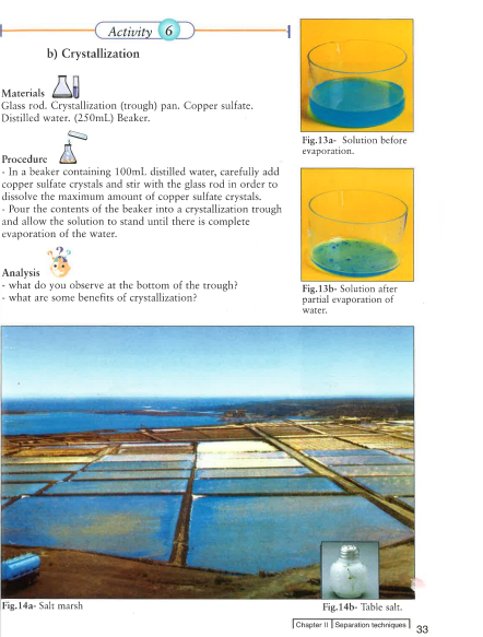 In the 7th grade Lebanese chemistry curriculum, one of the central topics in the chapter on separation techniques is crystallization. According to McGraw-Hill, crystallization involves separating a solid-phase precipitate from a solution, melt, vapor, or another solid phase. The concept is introduced in the Lebanese student book through an image of a salt marsh, illustrating the natural crystallization of salt within sea beds.