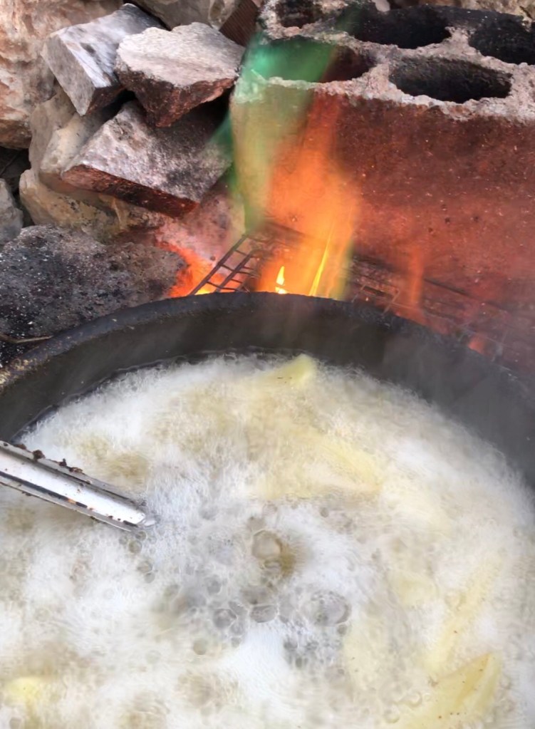 I was frying potatoes over a campfire when I noticed the production of a green flame. Directly, the flame tests of the elements from chemistry classes came to my mind and I tried recognizing the source.
