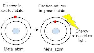 First, let us go over the flame test of chemicals: According to the qualitative analysis of chemical metal ions, the flame test visually determines the identity of an unknown metal ion according to the color of the flame. The heat of the flame excites the electrons of the metals ions into higher energy levels where they are energetically unstable. Hence, they tend to fall back down to their original energy levels, releasing energy as they do so in the form of light energy. This light has characteristic flame colors of different metal ions due to varying electron transitions.